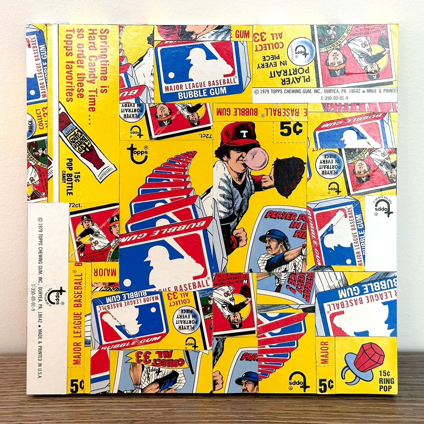 This 12" x 12" pop art piece features colorful graphics from a fan favorite box designs - 1979 Topps Major League Baseball Bubble Gum. This multi-directional composition is cut from a pair of actual display boxes. The box design features the Nolan Ryan comic, one of 33 in the set that came wrapped around the gum. The two additional generic players look a bit like Thurman Munson and Pete Rose. The box strips were cut and assembled as a one-of-a-kind configuration adhered to a wooden panel.